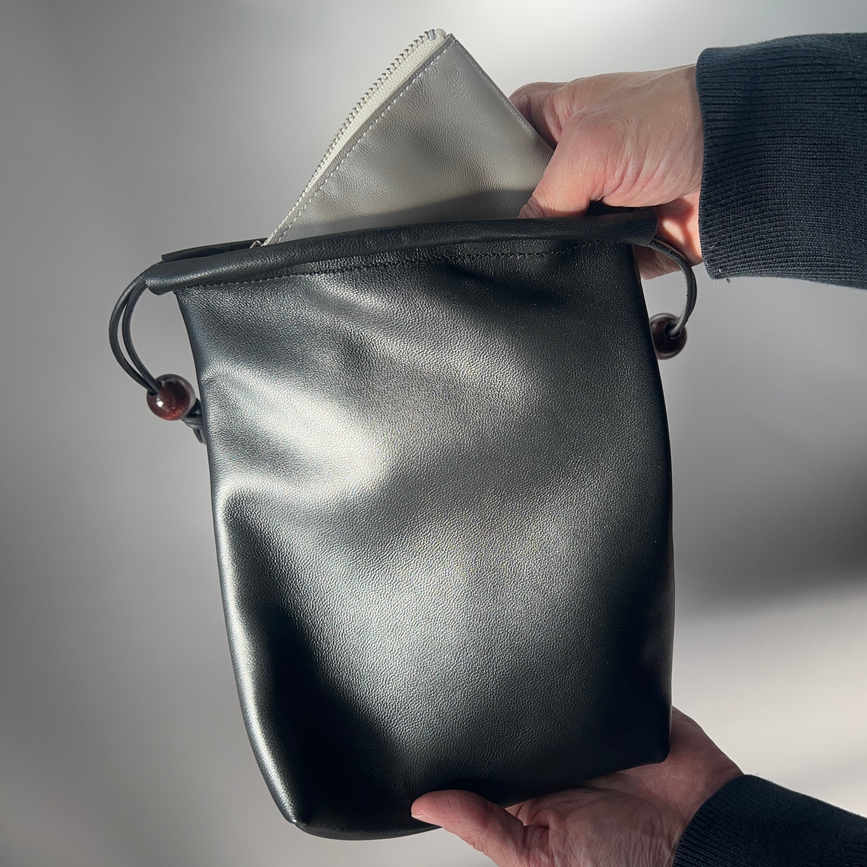 この羊革の巾着は、とても柔らかい手触りが特徴で、日常使いにこれひとつで財布やスマホなどちょっとしたお出かけに重宝するサイズ感。